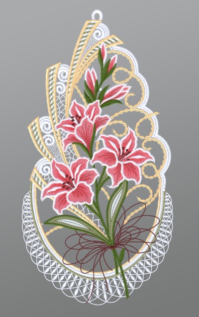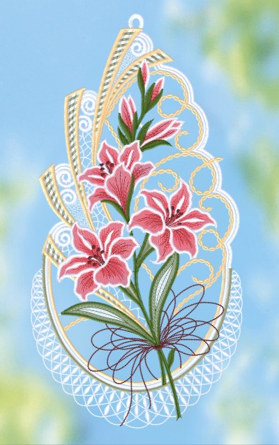 Fensterbild aus Plauener Spitze® - Gladiolenstrauß #1W mehrfarbig
