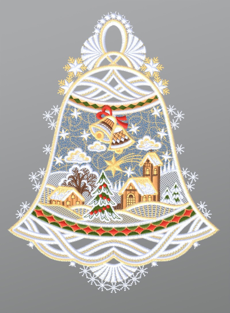 Fensterbild aus Plauener Spitze® - Glocke mit Winterszene #1W mehrfarbig