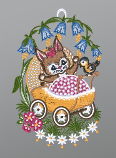 19,45 EURFensterbild aus Plauener Spitze® - Hasenbaby im Kinderwagen #1W mehrfarbig