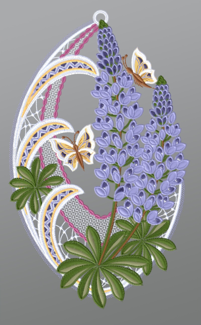 25,45 EURFensterbild aus Plauener Spitze® - Lupinen mit Schmetterlingen #1W in Violett-mehrfarbig