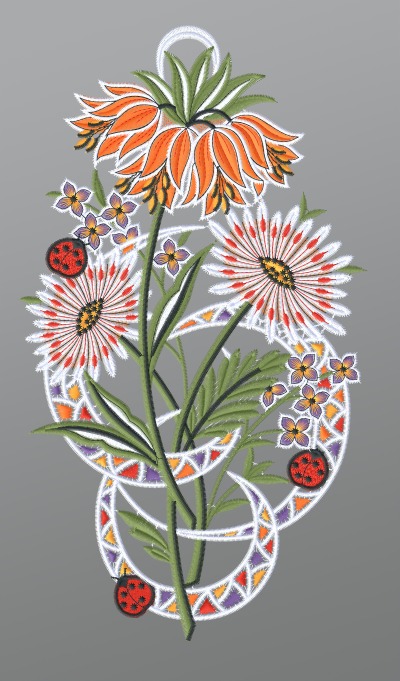 Fensterbild aus Plauener Spitze® - Kaiserkrone mit Marienkäfern #1W mehrfarbig