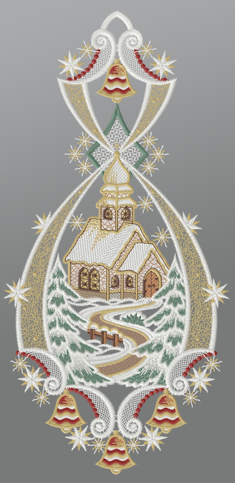 Fensterbild aus Plauener Spitze® - Kirche im Winterwald #1W mehrfarbig