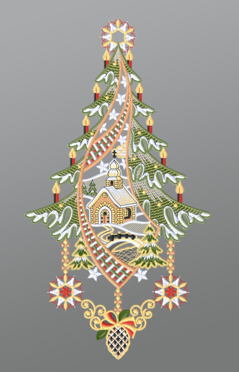 Fensterbild aus Plauener Spitze® - Kirche mit Winterlandschaft und Tannenbaum #1W mehrfarbig