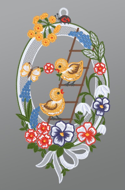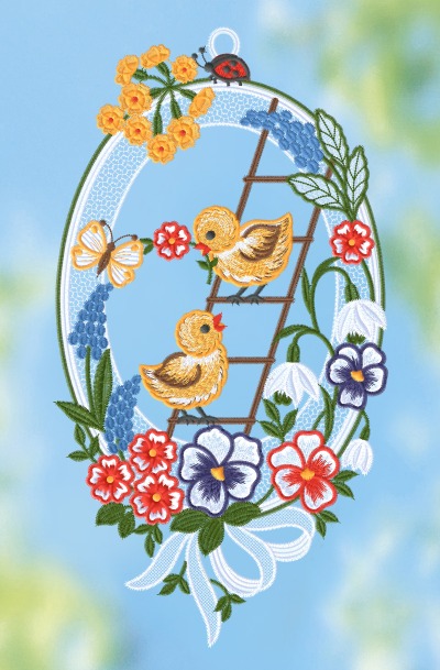 Fensterbild aus Plauener Spitze® - Küken auf Leiter #1W mehrfarbig