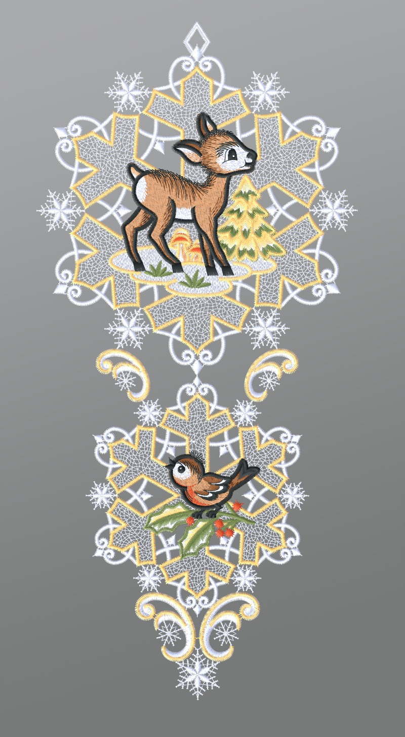 Fensterbild aus Plauener Spitze® - Rehkitz mit Vögelchen und Schneekristallen #1W mehrfarbig