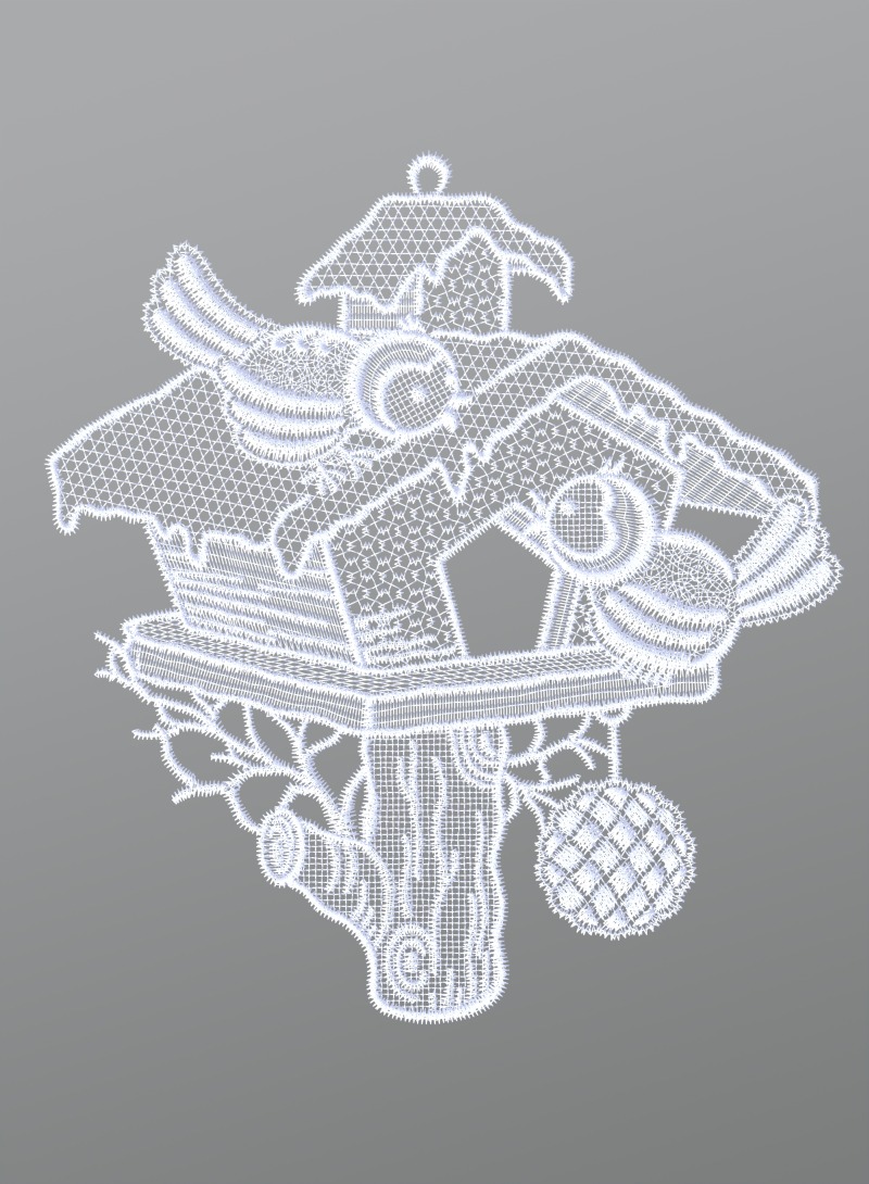 Fensterbild aus Plauener Spitze® - Vogelpaar mit Vogelhäuschen #1W in Weiß