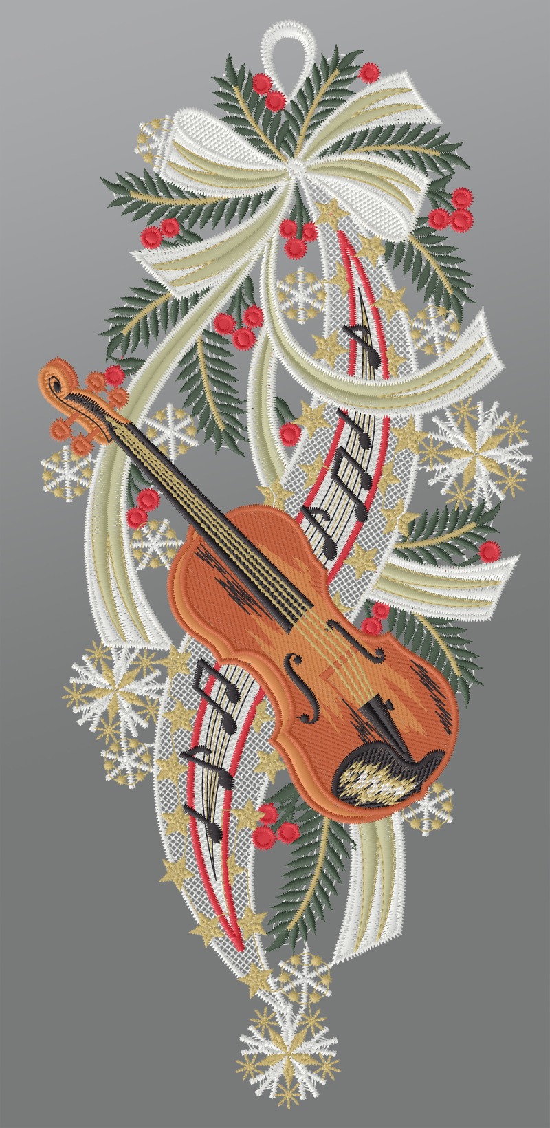 Das längliche Fensterbild von Plauener Spitze® präsentiert ein weihnachtliches Arrangement, bestehend aus Tannenzweigen, Schneeflocken und Bändern. Ein besonderes Element ist eine diagonal platzierte Geige in Cognacbraun, die als Highlight des Fensterbildes dient. Eingebunden ist auch eine Notenzeile, die sich durch eine rote Umrahmung deutlich abhebt. Die Vielfalt der Bänder und der dynamische Schwung des Designs verleihen dem Fensterbild einen abwechslungsreichen und lebendigen Charakter. Eine Schleife am oberen Ende des Fensterbildes fungiert als dekorative Zierde und verleiht dem Accessoire ein festliches Flair für die Adventszeit.
