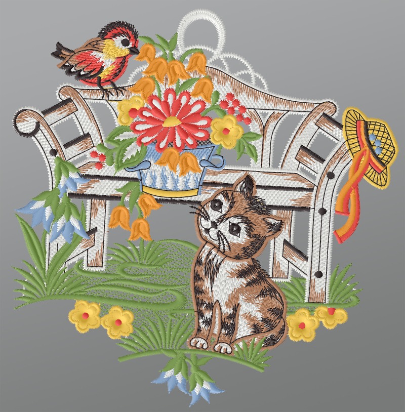 Das Fensterbild der Marke Plauener Spitze® stellt eine Holzbank in einer grünen, blumenreichen Umgebung dar. Die Bank, möglicherweise in einem naturnah gestalteten Garten, ist von einer Vielzahl an Pflanzen, Büschen und Gräsern in frischen Grüntönen umgeben. Ein charakteristisches Element ist ein Strohhut mit orangefarbenem Band, der lässig über die Lehne der Bank gelegt ist, was auf eine naturliebende Atmosphäre hindeutet. Das Bild wird durch bunte Blumen in Gelb- und Blautönen belebt. Ein Kätzchen, das zur Bank aufblickt, zieht die Aufmerksamkeit des Betrachters auf die ansprechende Bepflanzung, die auch Blumen in Rot- und Orangetönen enthält. Ein Rotkehlchen ist ebenfalls in die Szene integriert und den bunten Blumen zugewandt.