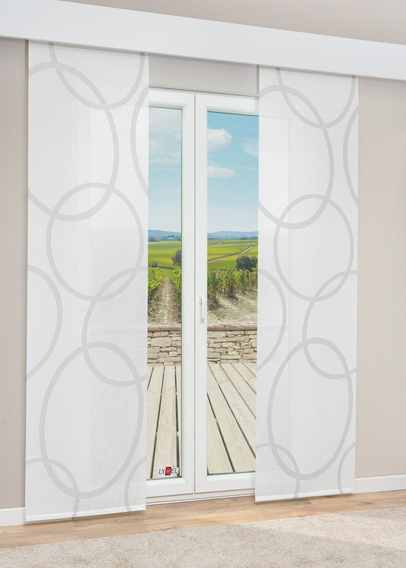 Fast schon olympisch geht es bei diesem halbtransparenten Schiebegardinenmodell zu. Sich überlappende überdimensionale Ringe schmücken die gesamte Stoffoberfläche und ziehen so die Aufmerksamkeit unweigerlich an. Der Behang kann Ihr Fenster aber nicht nur attraktiv schmücken. Er lässt stets ausreichend Helligkeit durchs Fenster und bietet Ihnen gleichzeitig einen gewissen Schutz vor neugierigen Blicken. Sie kreieren damit einen optisch individuellen Wohn-Look in Kombination mit angenehmen Lichtverhältnissen. Das Polyestergewebe ist umweltfreundlich und kann schonend bei 30°C mit der Maschine gewaschen werden. Befestigt wird der Flächenvorhang mit Klettband am Paneelwagen. Beides ist Bestandteil des Lieferumfangs, außerdem passende Aufsätze für alle gängigen Gardinenschienen, einen Beschwerungsstab sowie Mitnehmer und Aufsatz für einen Schleuderstab. Sie bekommen den Fensterschmuck maßgefertigt. Kürzungswünsche werden jedoch berücksichtigt.