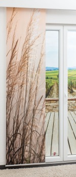 Die Gräser sind in unterschiedlichen Braun- und Beigetönen dargestellt und symbolisieren mit ihrem Farbverlauf die Licht- und Schattenwirkung des beinahe fotografischen Designs. Stimmungsvoll in Szene setzen lässt sich dieser Behang mit warmen Erdtönen, Grün oder Orange. Weitere Gräser als Dekoration intensivieren den natürlichen Ausdruck dieser Fensterdekoration.