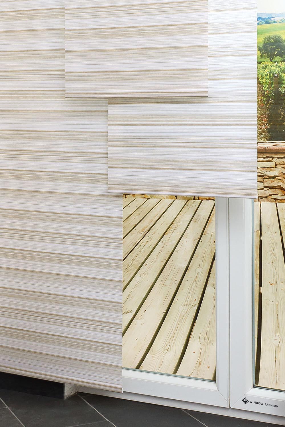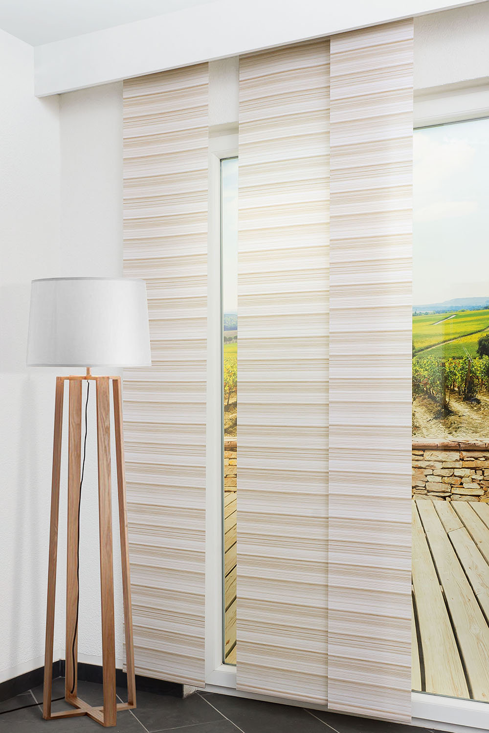 Diese Flächengardine erinnert mit seiner deutlich akzentuierten Webstruktur entfernt an Bambusmatten oder Grasgeflecht. Die naturnahe Farbgebung in feinen, den Stoff mit mehr oder weniger starken Kontraste melierenden Streifen verstärkt diesen Eindruck. Aber auch funktional hat dieser Flächenvorhang einiges vorzuweisen. So ist es zum Beispiel Teflonbeschichtet und damit äußerst resistent gegen Verschmutzungen. Der Stoff lässt etwas Licht in den Raum. So entsteht ein lebendiger und natürlicher Gesamteindruck, der vielen Räumen gut steht. Dieser Flächenvorhang präsentiert sich in natürlich-warmem Elfenbein und eignet sich besonders für gemütliche bis natürlich-gehobene Einrichtungsstile. Die feinen, den Stoff melierenden Linien ergeben aufgrund ihrer variierenden Dichte über die gesamte Schiebegardine betrachtet ein horizontales Streifenmuster.