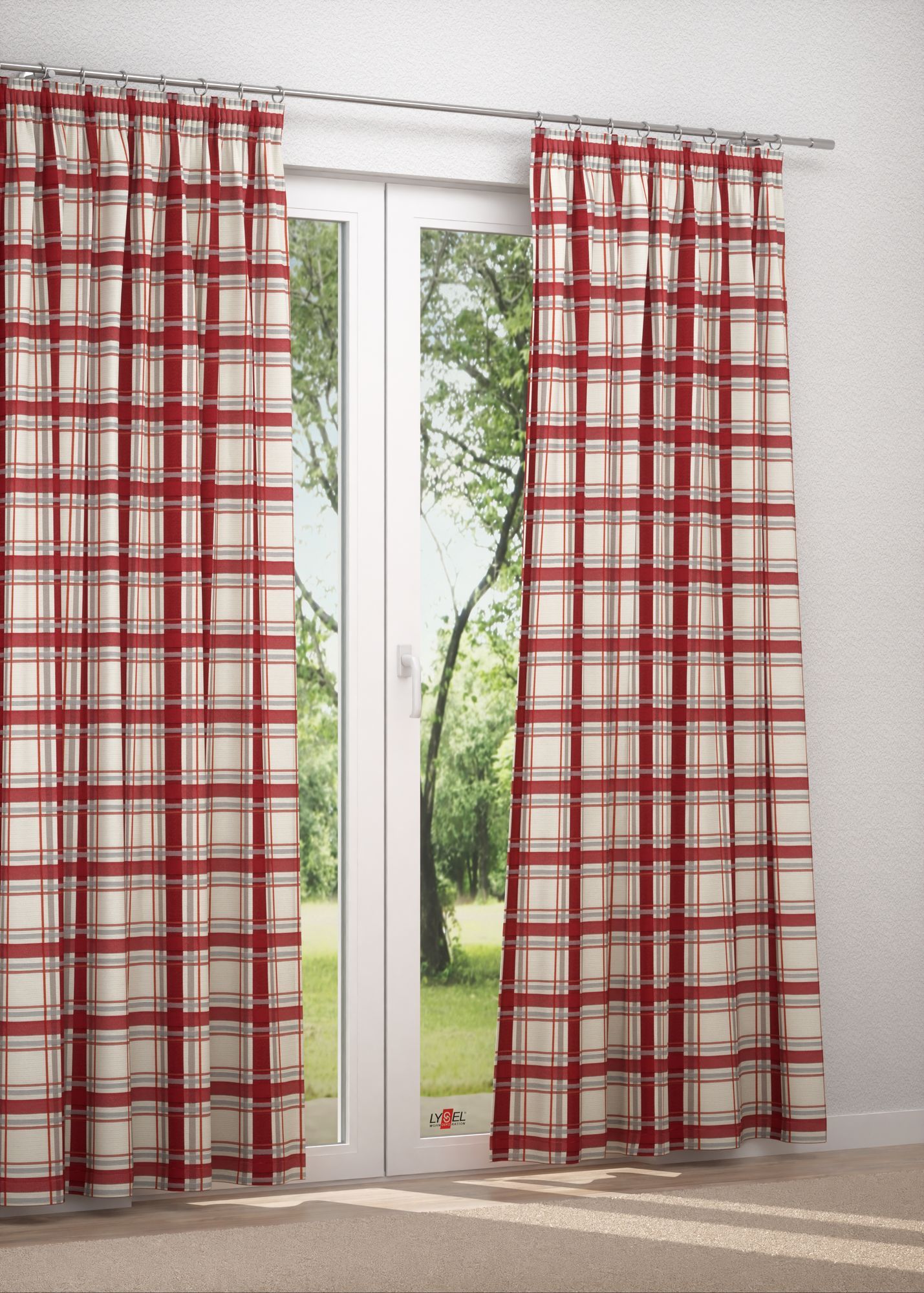 Das vorwiegend in Rot gestaltete Karomuster sorgt für ein besonderes Flair. Warm, energetisch und lebendig sucht es die Aufmerksamkeit des Betrachters, die anderen Farben geraten in den Hintergrund, was die Mehrdimensionalität des Designs unterstützt. Rot kann noch mehr leuchten, wenn Sie es mit Abstufungen von Grau, Creme und Beige in Verbindung bringen. Helles Holz, Rattan und frische Grüntöne schaffen ein angenehm wohnliches Flair.