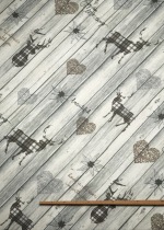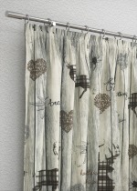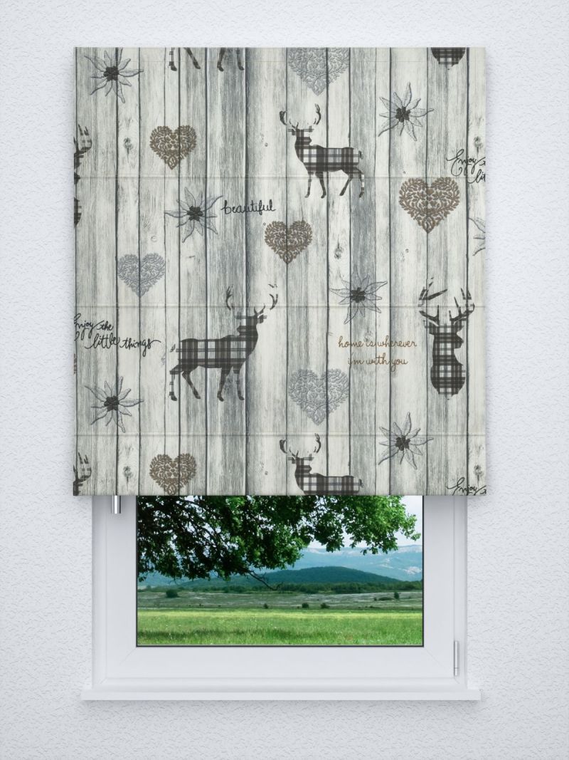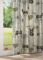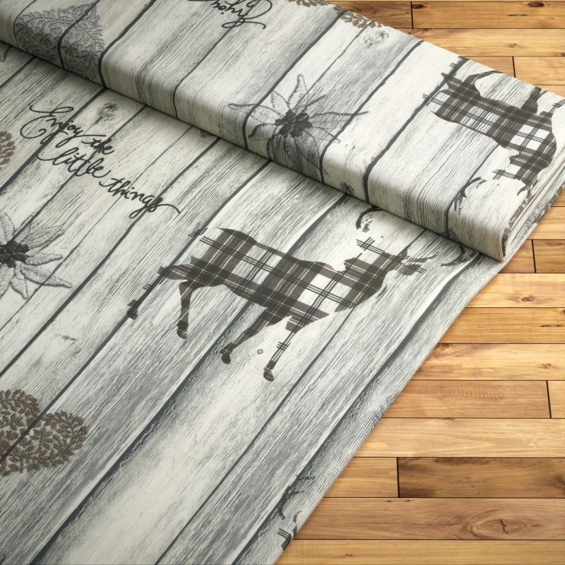Das Design dieses Stoffes steht ganz im Zeichen der Natur. Der Hintergrund wirkt durch die senkrecht angeordneten Holzbretter mit einzigartiger Maserung rustikal, bringt ein gemütliches und heimeliges Flair in den Raum. Die detailgetreue Gestaltung und die abwechslungsreichen Akzente verleihen dem Design Ausdruck und das gewisse Etwas. Auf den Holzbrettern sind in unterschiedlichen Abständen Blumen, gestickte Herzen und mit Karomuster ausgefüllte Hirsche angeordnet, die das rustikale, naturverbundene Flair noch hervorheben. Das Motiv wurde per Digitaldruck auf die Vorderseite des Polyesterstoffes aufgebracht. Aus der Meterware können Sie verschiedene Accessoires kreieren und selbst nähen. Gleichzeitig bietet der Konfigurator vielfältige Möglichkeiten, um Ihre maßgefertigte Fensterdeko nach Ihren Wünschen zu gestalten. Das lichtdurchlässige Gewebe sorgt weiterhin für Helligkeit im Raum, gleichzeitig bietet es einen zuverlässigen Sichtschutz. Ob Raffrollo, Gardinenschal, Tischdecke oder Kissenbezug: Aus dem flexiblen Stoff kann vieles werden.