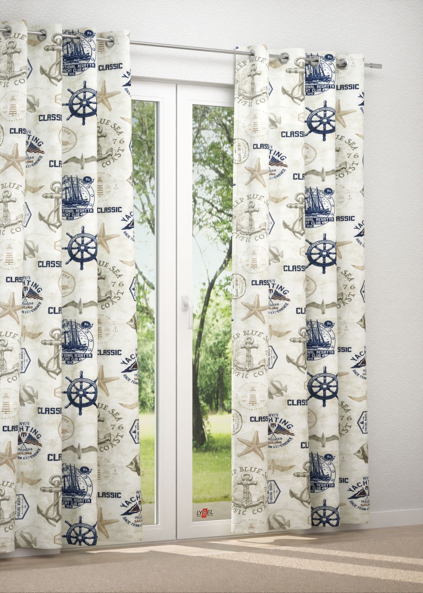Ein raues, maritimes Küstenflair transportiert dieser Stoff mit leichter Marmorierung. Die griffige Haptik und die an Leinen erinnernde Oberfläche sorgen für eine naturnahe Aura. Dabei kann der Hintergrund an tosende Wellen erinnern und bietet den dort aufgebrachten Elementen zum Thema Küste und Seefahrt die beste Bühne. Möwen, Leuchttürme, Flaggen, Schilder, Steuerräder und Anker sind nur ein paar Beispiele. Durch die feine Gestaltung und die vielen Details treten sie dezent, dennoch wirkungsvoll hervor. Der lichtdurchlässige Polyesterstoff ist als Maß-Artikel und als Meterware erhältlich, sodass Sie Accessoires wie Kissenbezüge und Tischläufer auch selbst nähen können. Eine Fensterdeko, etwa einen Gardinenschal nach Maß, stellen Sie sich individuell im Konfigurator zusammen, entscheiden dabei auch, wie der obere Abschluss und untere Abschluss aussehen sollen.