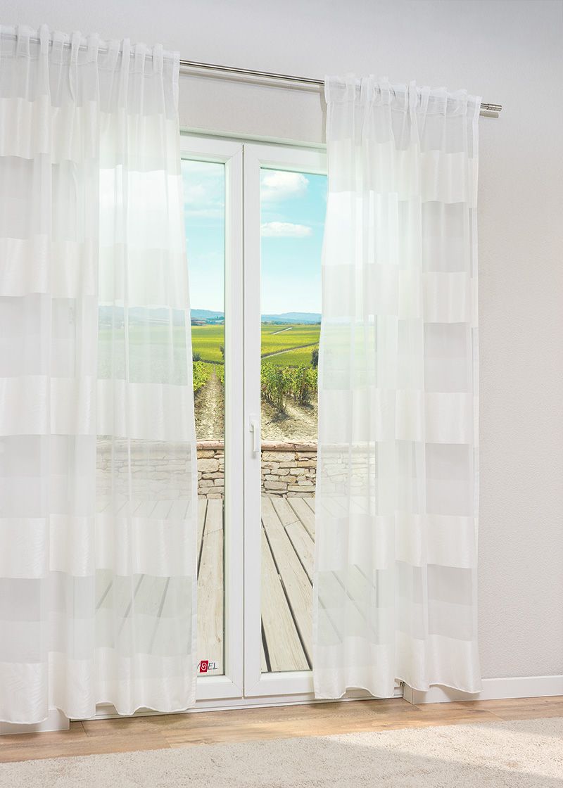 Mit einem eindrucksvollen Streifenmuster präsentiert sich dieser Gardinenschal. Das Muster setzt sich aus breiten transparenten Streifen in Weiß und blickdichten Strukturstreifen mit schimmerndem Blätterdesign zusammen, welches auf der Rückseite in Negativ-Optik zu sehen ist. Insgesamt lässt der Zugbandschal viel mildes Licht hindurch, bietet teilweise Sichtschutz und wird als halbtransparent bezeichnet. Der Dekoschal mit Multifunktionsband vereint also stilvolle Eleganz mit ruhiger Natürlichkeit in modernem Design. An den Seiten und am Abschluss ist der Stoff gesäumt, er kann auf Wunsch auf die individuelle Länge angepasst und auf die passenden Maße gebracht werden.