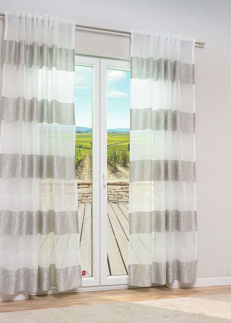 Mit einem eindrucksvollen Streifenmuster präsentiert sich dieser Gardinenschal. Das Muster setzt sich aus breiten transparenten Streifen in Weiß und blickdichten Strukturstreifen mit schimmerndem Blätterdesign zusammen, welches auf der Rückseite in Negativ-Optik zu sehen ist. Insgesamt lässt der Zugbandschal viel mildes Licht hindurch, bietet teilweise Sichtschutz und wird als halbtransparent bezeichnet. Der Dekoschal mit Multifunktionsband vereint also stilvolle Eleganz mit ruhiger Natürlichkeit in modernem Design. An den Seiten und am Abschluss ist der Stoff gesäumt, er kann auf Wunsch auf die individuelle Länge angepasst und auf die passenden Maße gebracht werden.