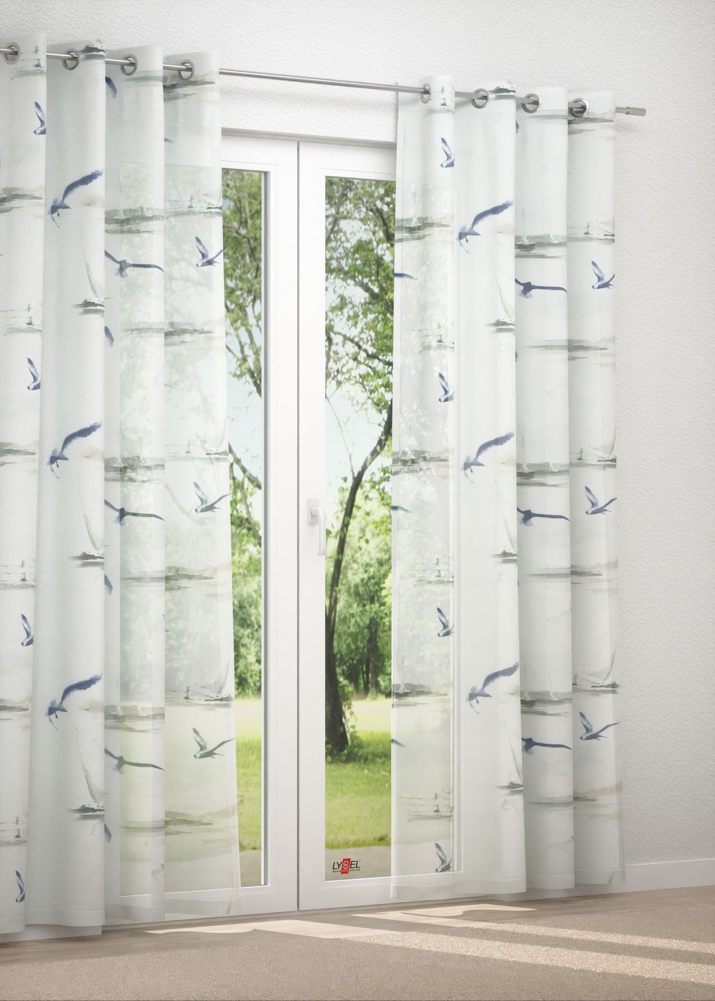 Dieses transparente Gewebe mit leichter Struktur lässt Naturmotive erkennen, deren Darstellung durch die Farbverläufe an Wasserfarben oder Aquarelltechnik erinnert. Auf dem hellen Stoff ist unter anderem ein an eine Schwalbe erinnernder Vogel sowie eine längliche abstrakte Form zu sehen, die wie die Rinde eines Baumes wirkt. Dieser Dekostoff kann für Raffrollos und Gardinenschals gleichermaßen verwendet werden. Eine Fensterdeko aus diesem durchsichtigen Stoff erfüllt rein ästhetische Zwecke und dämpft den Lichteinfall nur etwas ab, trägt dadurch zu einer hellen, offenen und einladenden Atmosphäre bei.