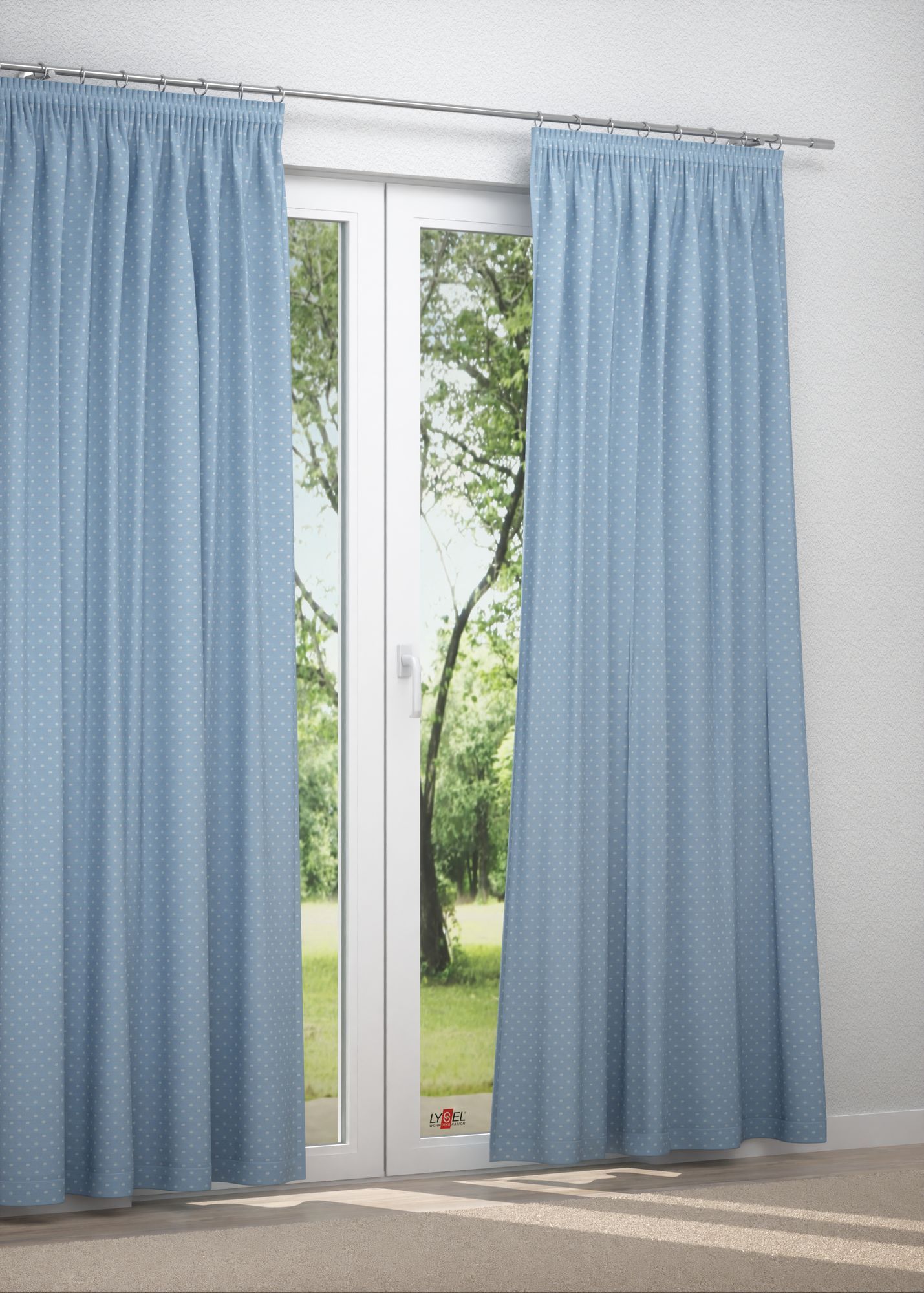 Gestaltet in mildem Himmelblau schafft der Stoff mit den hellen, schimmernden Punkten eine ruhige und vertraute Atmosphäre. Das frische und freundliche Flair kann sich in Verbindung mit hellem Holz, ruhigen Erdfarben und vielen Zimmerpflanzen besonders gut entfalten und lässt den Raum noch einladender und wohnlicher wirken. Durch die Kombination mit viel Weiß, hellen Beige- und Cremetönen, Rosé sowie weiteren Nuancen von Blau und Grau wirkt das Gesamtbild ausgesprochen geschmackvoll und harmonisch.