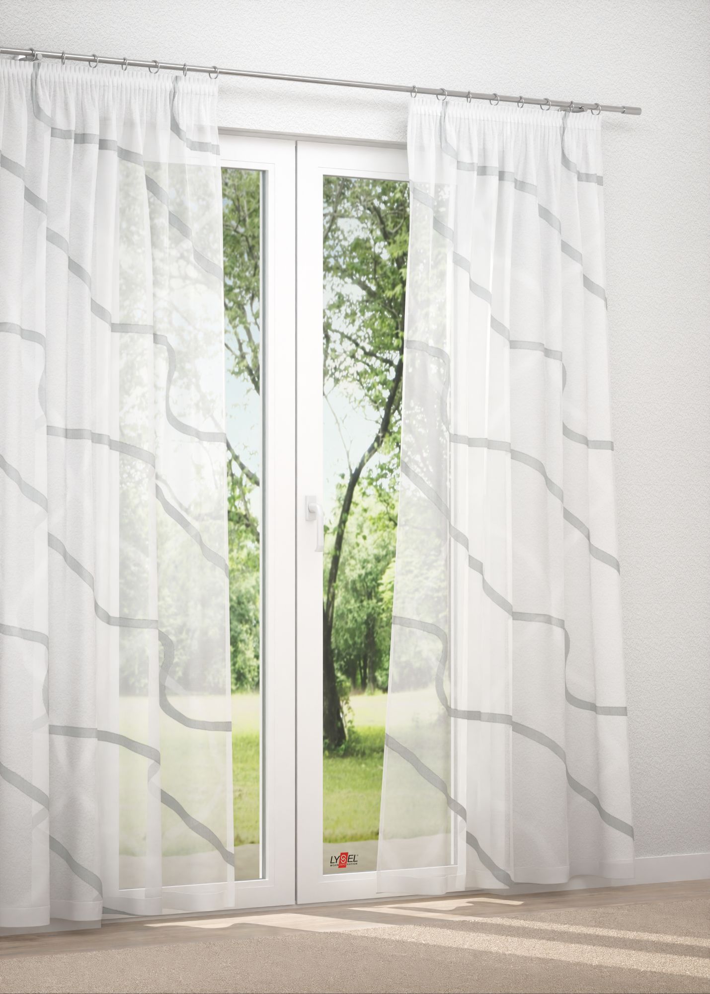 Das abstrakte Muster, das sich großflächig und dynamisch durch den gesamten Stoff zieht, wurde in Scherli-Technik eingefügt, die vor allem an den ausgefransten Rändern erkennbar ist. In den Grundstoff wurden die fein gestreiften, geschwungenen Linien, eingewebt. Diese treten hier durch die plastische Optik hervor und unterscheiden sich außerdem durch die dunklere Gestaltung von dem Hintergrund. Die Wirkung des Musters und die zarte Eleganz des durchsichtigen Gewebes kommen bei einer Fensterdeko besonders gut heraus. Diese können Sie beispielsweise als Raffrollo oder Gardinenschal nach Maß im Konfigurator zusammenstellen. Ziert der Stoff das Fenster, wirkt der Raum optisch größer, außerdem lichtdurchflutet und freundlich. Für Tischwäsche bietet sich der elegante Stoff ebenfalls an. Damit Sie eigene Deko-Ideen kreativ umsetzen können, können Sie diesen auch als Meterware bestellen.