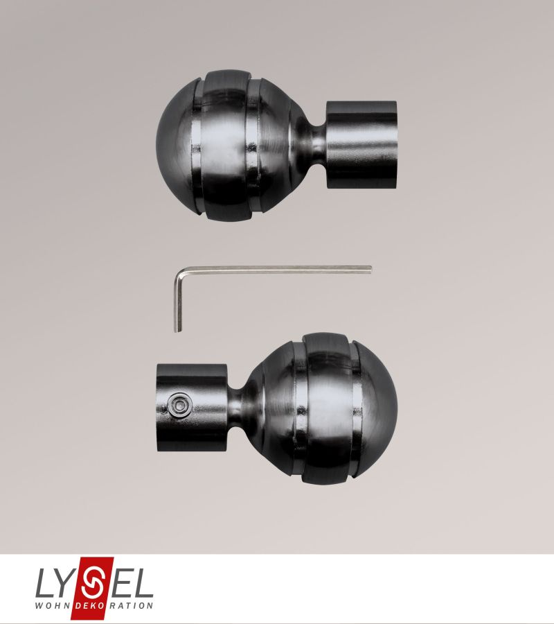 Diese Endstücke aus Metall haben die Form einer Kugel und können Opal Gardinenstangen sowie andere Gardinenstangen mit einem Durchmesser von 20 mm zieren. Mit dem beiliegenden Innensechskantschlüssel werden sie fixiert und auf die gleiche Weise können die Endstücke wieder entfernt werden. Durch zwei breite Einkerbungen wird die Kugel in drei Bereiche unterteilt und kann ferner an einen Türknauf erinnern.