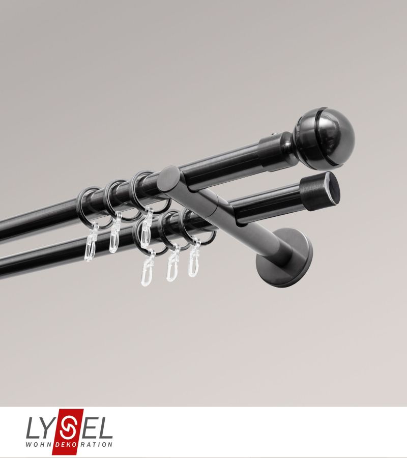 Zwei Gardinenstangen, das bedeutet doppelte Flexibilität, in der Gestaltung wie im Sicht- und Sonnenschutz. Ideal zur Befestigung der klassischen Kombination aus zarter Gardine und lichtdichtem Vorhang, aber auch für das Spiel mit verschiedenen Farben, Formen oder Längen ähnlicher Stoffe. Allein das metallische Material sorgt für einen Hauch Moderne. Verstärkt wird dieser Eindruck aber durch die Befestigung der Stangen auf oder unter dem Kombiträger. Durch die offene Halterung scheinen die Stangen förmlich zu schweben. Besonderer Clou: Die vordere Aufnahme lässt sich drehen. Somit können die Gardinen auch in der Höhe leicht versetzt dekoriert werden. Die beiliegenden Gardinenringe sind mit Kunststoffhaken und einer geräuschdämpfenden Beschichtung ausgestattet. Schmückend fügen sich nicht zuletzt die unterschiedlichen Endstücke ins Gesamtbild ein. An der hinteren Stange bildet eine schlichte Kappe den Abschluss. Die vordere Stange zieren große, mit schmalen Rillen verzierte Kugeln, die mit dem beiliegenden Innensechskantschlüssel fixiert werden.