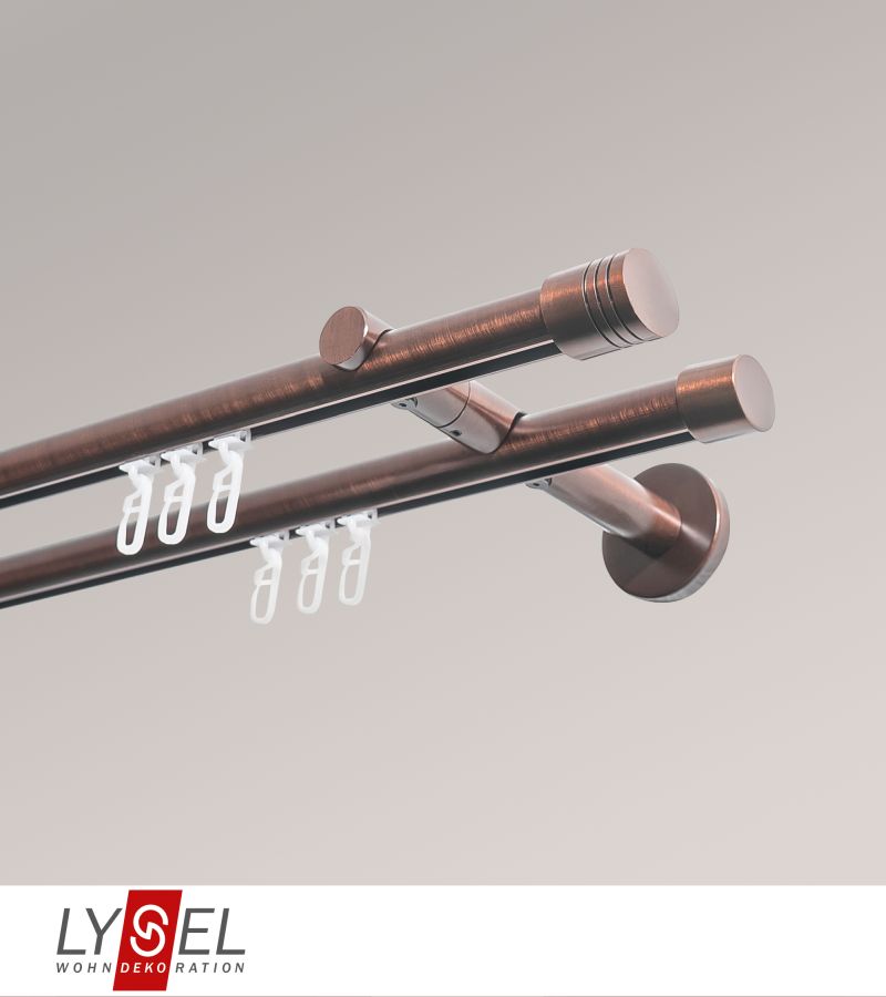 Dieses Set beinhaltet neben den runden Metallstangen auch offene Doppel-Kombiträger aus Metall, Befestigungsmaterial und Klickgleiter aus Kunststoff, die an jede Stelle der Innenläufe eingesetzt werden können. Die zylinderförmigen Endstücke mit den drei Einkerbungen unterstreichen den modernen und reduzierten Charakter dieses Zubehörs. Während diese mit dem beiliegenden Innensechskantschlüssel fixiert werden müssen, genügt bei den schlichten Endkappen der hinteren Stange ein einfaches Aufstecken. Die Kombiträger werden an die Wand geschraubt, die Stangen anschließend von unten in die halbrunden Öffnungen eingesetzt. Ab einer gewissen Länge sind außerdem Verbinder im Lieferumfang enthalten, mit welchen Sie die einzelnen Gardinenstangen zusammenführen. Auf Wunsch kürzen wir die Gardinenstangen gern für Sie auf das passende Maß.