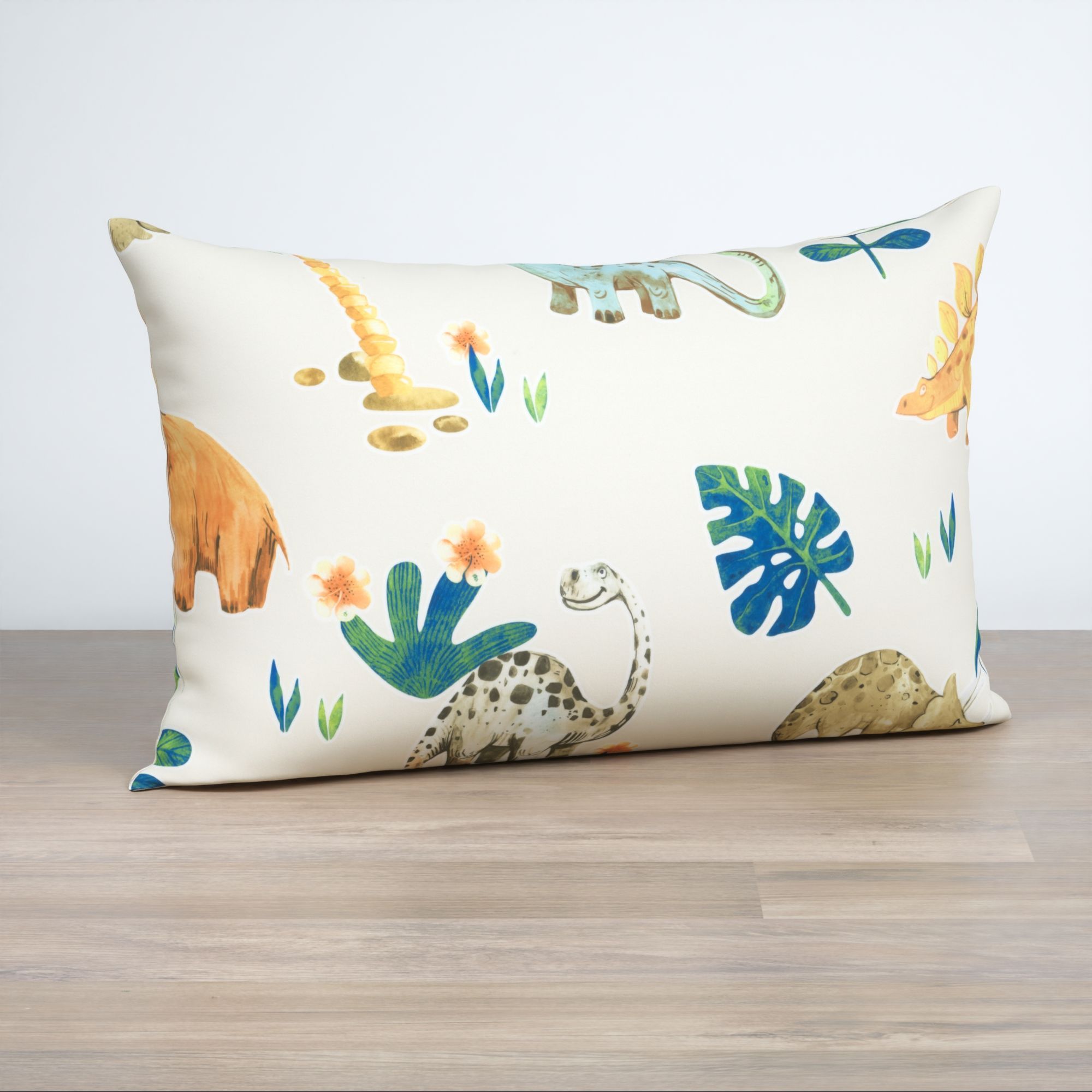 Der cremefarbene Hintergrund erinnert an feinen Sand, dazu die grün-orangen Palmen: Es ist fast ein tropisches Flair, das entsteht, wenn diese Farben aufeinandertreffen. Die Dinos sind unterschiedlich gestaltet, mal in leuchtendem Gelborange, mal eher gediegen in Blau und Braun. Die Farbgebung wurde offensichtlich an den Charakter der Tiere angepasst. Naturfarben und weitere Grüntöne sowie viele Zimmerpflanzen setzen das Design perfekt in Szene.