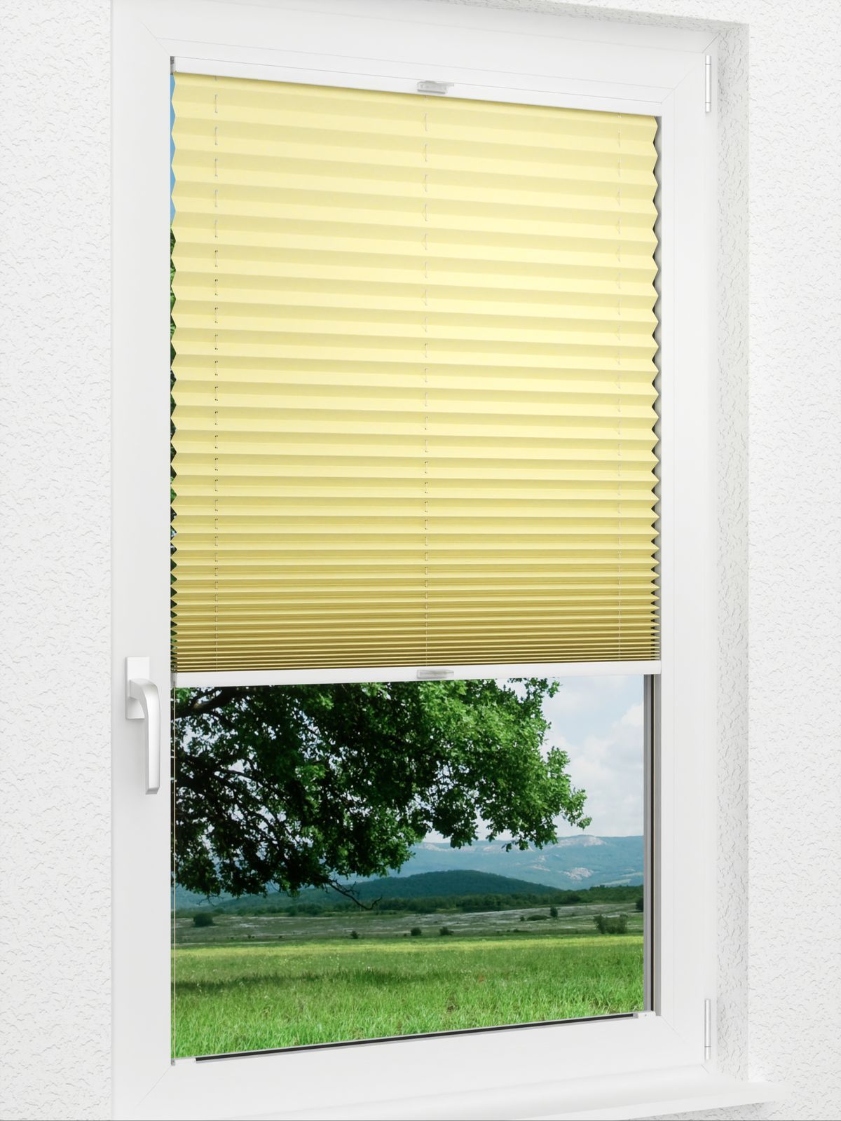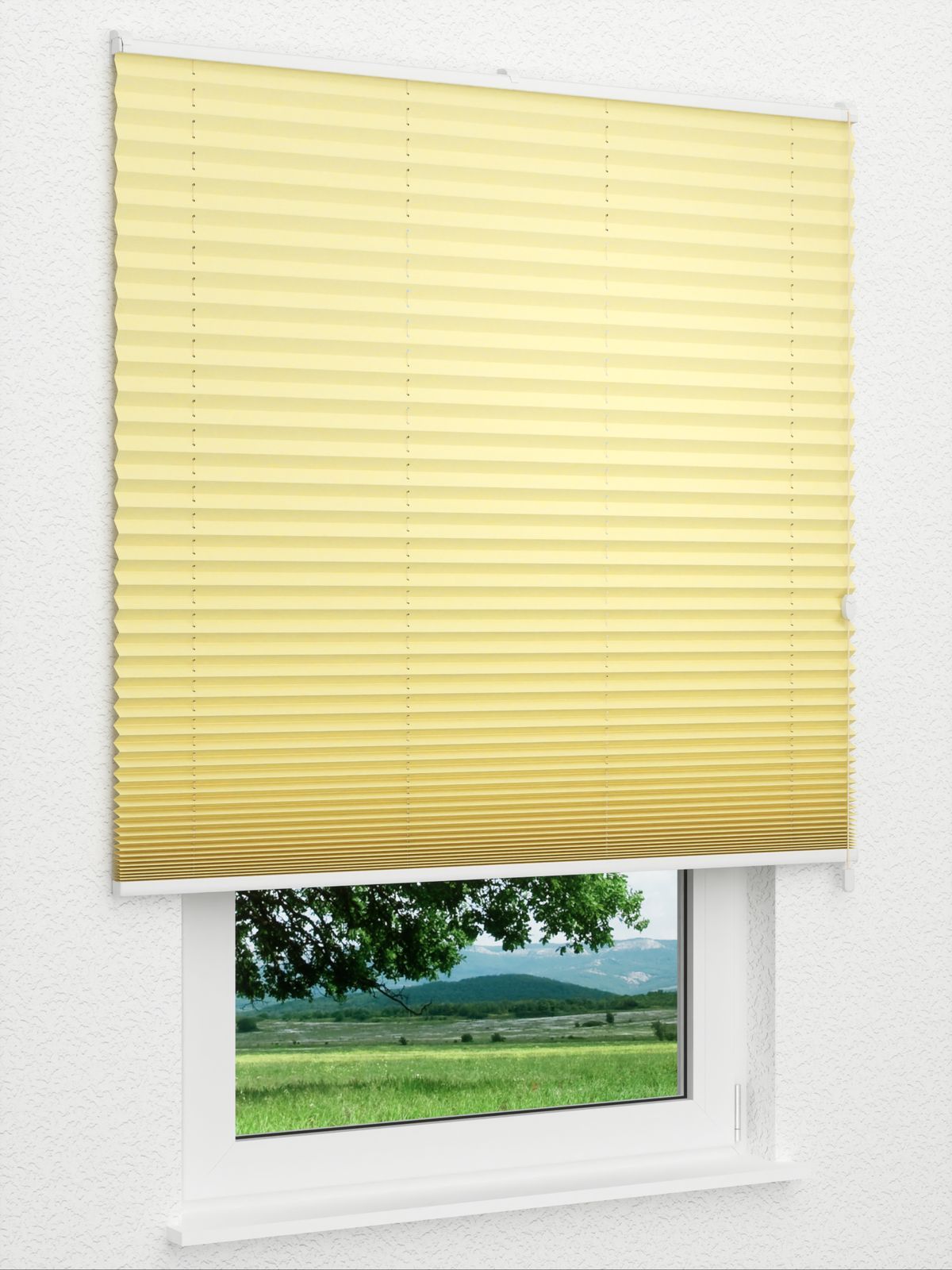 Mit der feinen Crush-Struktur der Oberfläche und der Perlreflex beschichteten Rückseite ist dieses Plissee nicht nur eine dezente Fensterdeko, sondern überzeugt vor allem durch seine vielfältigen anderen Einsatzmöglichkeiten. So erlaubt das schwer entflammbare Gewebe die Verwendung in öffentlichen Objekten, in Feuchträumen wie Bad und Küche und dient noch dazu tagsüber wie abends als zuverlässiger Sichtschutz. Das lichtdurchlässige Gewebe gestaltet das Ambiente trotzdem hell und freundlich, selbst dann, wenn der Behang komplett geschlossen ist. Bei Bedarf reinigen Sie das Plissee durch feuchtes Abwischen oder die schonende Handwäsche bei 30 Grad. Mild und freundlich wirkt das Plissee in Blassgelb am Fenster. Dabei versprüht es eine zarte Wärme, die auf den gesamten Raum übergeht. Lebendige Grüntöne, helles und rötliches Holz, ruhiges Grau und Schwarz-Weiß Muster setzen die Deko geschmackvoll in Szene.