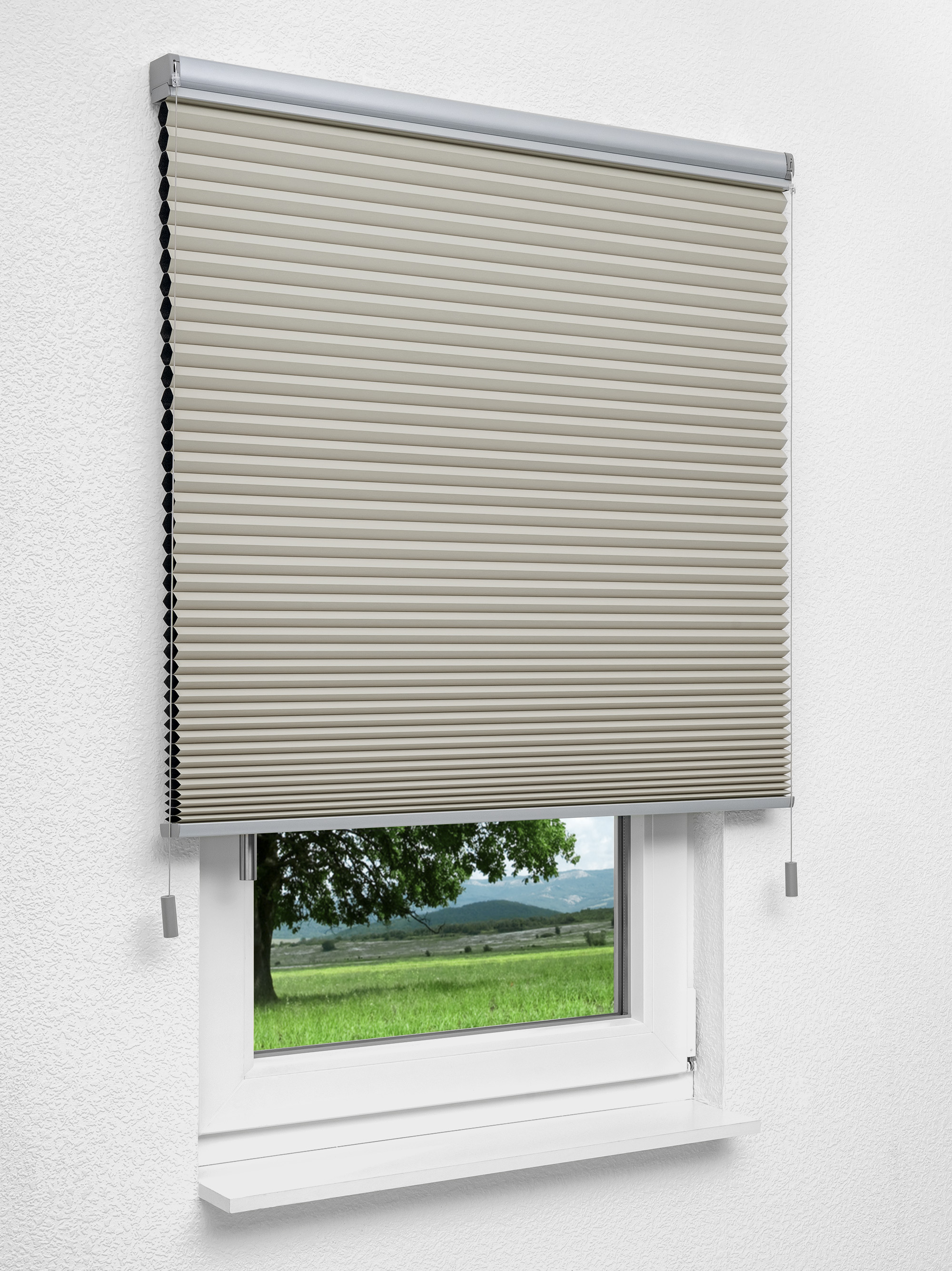 Dieses unifarbene Wabenplissee mit weißer Rückseite kann mit vielfältigen praktischen Eigenschaften aufwarten. Die isolierenden Luftkammern entstehen durch zwei übereinandergelegte Stoffschichten, die auf der Innenseite noch mit einer Aluminiumbeschichtung versehen sind und daher isolierend wirken. Somit schützt dieses Wabenplissee am Fenster gegen Wärme, Kälte und Zugluft. Im Wintergarten trägt es zu einem angenehmen Raumklima bei, wodurch das Verweilen unterm Glasdach auch bei heißen Temperaturen nicht zu einem tropischen Erlebnis wird. Um den Polyesterstoff zu reinigen, können Sie ihn einfach feucht abwischen. Darüber hinaus zeichnet sich dieses Wabenplissee auch durch abdunkelnde Eigenschaften aus, welche den Raum noch gemütlicher machen. Es entsteht ein lauschiges und wohlbehütetes Ambiente, das unabhängig von der Helligkeit draußen zum Relaxen und Entspannen einlädt. Der freundliche Beigeton verleiht dem Wabenplissee eine schöne Natürlichkeit. Im Raum versprüht er eine dezente Wärme, die für Wohnlichkeit und Gemütlichkeit sorgt. Satte Grüntöne passen hier ebenso wie zartes Pastell und Nude sowie verwandte Erdfarben. Dunkle Rottöne wärmen das Ambiente weiter auf, Violetttöne machen es speziell. Für ein skandinavisches Interieur nehmen Sie viel Weiß und Grau sowie rauchige Blautöne. Bitte beachten Sie, dass sich die Bezeichnung "abdunkelnd" ausschließlich auf den Stoff bezieht. Ein seitlicher Lichtspalt ist bei allen Montagearten zu erwarten. Er fällt geringer aus, wenn der Überstand des Plissees über die Fensterfläche größer ist (Wandmontage).