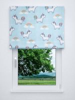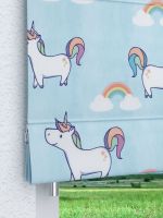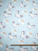 Auf diesem bunt und fantasievoll gestalteten Stoff spielen Einhörner die Hauptrolle. Die magischen Figuren tragen Mähne und Schweif in pastelligen Farben. Die Einhörner sind versetzt auf dem Stoff angeordnet und blicken sich freundlich an. Dazwischen sind noch Regenbögen in leuchtenden Farben platziert, wobei es so scheint, als würden Anfang und Ende jeweils aus einer Wolke entspringen. Das freundliche und zauberhafte Design ist für Kinderzimmer-Accessoires ideal. Diese können Sie aus der Meterware ganz leicht selbst nähen. Der Konfigurator bietet die Möglichkeit unter anderem Gardinenschals nach Maß individuell zusammenzustellen. Dabei können Sie zum Beispiel die Aufhängung festlegen. Dem lichtdurchlässigen Polyestergewebe mit Transferdruck auf der Vorderseite gelingt die Balance zwischen Helligkeit und Sichtschutz. Der zarte, hellblaue Himmel bietet den perfekten Hintergrund für die bunten Fabelwesen.