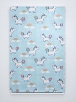 Dabei sind die Einhörner mit lilafarbenen Umrandungen und Schattierungen gestaltet, was sie noch magischer wirken lässt. Ihren Schweif und die Mähne präsentieren die Einhörner anmutig in den gedeckten Tönen Apricot, Himbeerrosa, Lindgrün und Pastellviolett. Die Farben des Regenbogens leuchten nochmal mehr. Eine Einrichtung in Blautönen, Weiß und Grau setzt das Design wirkungsvoll in Szene.