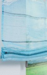 Die Blautöne dieses Raffrollos reichen von eindrucksvollem Petrol bis hin zu sommerlichem Türkis. Durch das zarte Wellenmuster wirkt es beruhigend und transportiert Sie gedanklich vielleicht sogar an den Strand. Am schönsten wirkt dieser Fensterschmuck mit sandähnlichen Tönen wie Creme und Beige, hellen Graunuancen und viel Weiß. Accessoires aus Stroh, Bast und Seegras erzeugen ebenso wie naturbelassene Holzmöbel ein wohnliches Ambiente.