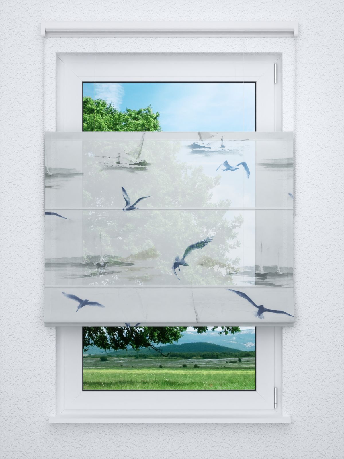 Dieses transparente Gewebe mit leichter Struktur lässt Naturmotive erkennen, deren Darstellung durch die Farbverläufe an Wasserfarben oder Aquarelltechnik erinnert. Auf dem hellen Stoff ist unter anderem ein an eine Schwalbe erinnernder Vogel sowie eine längliche abstrakte Form zu sehen, die wie die Rinde eines Baumes wirkt. Dieser Dekostoff kann für Raffrollos und Gardinenschals gleichermaßen verwendet werden. Eine Fensterdeko aus diesem durchsichtigen Stoff erfüllt rein ästhetische Zwecke und dämpft den Lichteinfall nur etwas ab, trägt dadurch zu einer hellen, offenen und einladenden Atmosphäre bei.