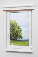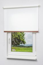 Die Ausführung in Weiß hebt die Holzdekorleiste in einem ansprechenden Braunton besonders hervor, wodurch sie ihre warme Ausstrahlung im Raum entfalten kann. Die Kombination aus der klaren Linienführung des Rollos und der heimeligen, gemütlichen Wirkung des Holzes ergänzt sich hier ausgezeichnet. Dies lädt dazu ein, den Raum mit weiteren Naturmaterialien und frischen Grüntönen, auch in Form von immergrünen Pflanzen, zu gestalten.