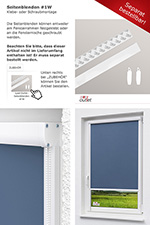 Das Kassettenrollo bietet verlässliche Funktion und gradlinige Erscheinung. Der verdunkelnde Stoff wird durch das Verstauen innerhalb der Kassette stilvoll ergänzt. Dafür stehen verschiedene Ausgangsmaße als Varianten bereit. Sollte das genau passende Maß für Ihr Fenster nicht passen, lässt sich mit etwas handwerklichem Geschick die Breite des Rollos mit einer Metallsäge und einer guten Stoffschere genau anpassen. Da die Länge ohnehin variabel ist, erhält man mit diesem Rollo am Ende eine beinahe maßgefertigte Lösung am Fenster. Der Stoff wird über die rechtsseitig angebrachte Kette stufenlos bedient. Für Kindersicherheit nach DIN EN 13120 von Kindern sorgt ein transparenter Kettenhalter. Das mitgelieferte Zubehör ermöglicht die verschraubte Montage an Decke oder Wand oder aber die Klebemontage direkt auf dem Fensterflügel. Zum Kassettenrollo können noch diverse Zubehörteile ergänzend bestellt werden: Sie haben die Option, das Kassettenrollo mit einer Pendelsicherung zum Kleben oder Klemmen auszustatten. Bei optimaler Verdunkelung empfehlen wir die extra bestellbaren Seitenblenden. Alle separat bestellbaren Zubehörteile sind nicht im eigentlichen Lieferumfang des Rollos enthalten.