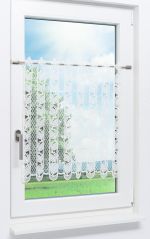 Entlang der Rapporte dieser aus lockerem Spitzengeflecht gearbeiteten Scheibengardine windet sich eine Ranke mit großen Blättern und Knospen. Sie scheint nach oben zu wachsen, erstreckt sich über die gesamte Länge der Scheibengardine. Am oberen Abschluss, in welchen auch die Aussparungen für den Stangendurchzug integriert sind, ragen die Blätter über diesen hinaus. Zwischen den Rapporten ist ein wabenförmiges Netz eingefügt, wodurch das Gesamtbild aufgelockert und nochmals abwechslungsreicher gestaltet wird. Am unteren Abschluss fällt auf, dass die beiden Bereiche auf unterschiedlicher Höhe enden, mit einem abwechselnd mal mehr, mal weniger ausgeprägten Bogen. Das hauchzarte, unifarbene Polyestergewebe beeinflusst den Lichteinfall durchs Fenster kaum, erfüllt zum Beispiel als Bistrogardine in der Küche ausschließlich dekorative Zwecke. Sie können den Behang im Nu auf eine Scheibenstange aufziehen, zudem schonend bei 30 Grad von Hand waschen.