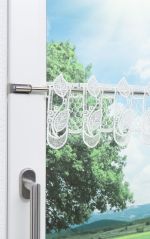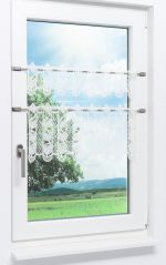 Entlang der Rapporte dieser aus lockerem Spitzengeflecht gearbeiteten Scheibengardine windet sich eine Ranke mit großen Blättern und Knospen. Sie scheint nach oben zu wachsen, erstreckt sich über die gesamte Länge der Scheibengardine. Am oberen Abschluss, in welchen auch die Aussparungen für den Stangendurchzug integriert sind, ragen die Blätter über diesen hinaus. Zwischen den Rapporten ist ein wabenförmiges Netz eingefügt, wodurch das Gesamtbild aufgelockert und nochmals abwechslungsreicher gestaltet wird. Am unteren Abschluss fällt auf, dass die beiden Bereiche auf unterschiedlicher Höhe enden, mit einem abwechselnd mal mehr, mal weniger ausgeprägten Bogen. Das hauchzarte, unifarbene Polyestergewebe beeinflusst den Lichteinfall durchs Fenster kaum, erfüllt zum Beispiel als Bistrogardine in der Küche ausschließlich dekorative Zwecke. Sie können den Behang im Nu auf eine Scheibenstange aufziehen, zudem schonend bei 30 Grad von Hand waschen.