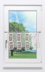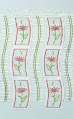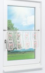 Nicht nur durch die bunten Farben, auch durch die geschwungenen Rapporte fällt diese transparente Scheibengardine sofort ins Auge. Das mit feiner Häkelspitze dekorierte Modell trägt zu einem wohnlichen Ambiente bei. Bei genauem Hinsehen erkennt man, dass die eingerahmten Blumen auf den Rapporten in unterschiedliche Richtungen zeigen. Mal befindet sich das konturierte Blatt links, mal rechts. Die Gestaltung zwischen den Rapporten kann an einen Reißverschluss oder Bahnschienen erinnern. Der farbige Doppelstreifen in der Mitte zeichnet nochmal die Wellenlinie nach. Am geraden oberen Abschluss sind amplitudenförmig Fäden angebracht, die dem Stangendurchzug dienen. Die Scheibengardine können Sie einfach und schnell auf eine Gardinenstange auffädeln. Das lockere Polyestergewebe lässt das Licht weiterhin in den Raum, diesen freundlich und einladend wirken.