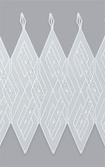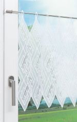 Die außergewöhnliche, spitze Form dieser Scheibengardine entsteht durch aneinandergefügte Rauten. Durch die übereinandergelegten und ineinander übergehenden Formen entsteht ein dreidimensionaler Eindruck. Im Inneren der Rauten ist zudem ein feines Spitzengeflecht eingearbeitet. Insgesamt erinnert das Design auf eine abstrakte Art und Weise an einen geschliffenen Diamant. Für den Stangendurchzug wurden außerhalb des eigentlichen Stoffes Schlaufen, ebenfalls rautenförmig, angefügt, durch welche die Gardinenstange hindurchgefädelt wird. Das hauchfeine, transparente Polyestergewebe dient am Fenster ausschließlich als Zierde, weiterhin kommt viel Licht in den Raum, wodurch dieser einladend und gemütlich wirkt. Unter Berücksichtigung des Rapports von 8 cm ist diese Bistrogardine in verschiedenen Breiten erhältlich.