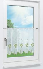 Erfrischend und freundlich wirkt das Design dieser weißen Scheibengardine. Die in lebendigem und vitalisierendem Maigrün gestalteten Kleeblätter bringen mitsamt der Umrandung und dem weißen Stoff eine angenehme Frische in den Raum, wirken anregend und inspirierend. In Kombination mit hellem und rötlichem Holz, zarten Pastelltönen und vielen Zimmerpflanzen schaffen Sie ein stimmiges Ambiente zum Entspannen und Wohlfühlen.