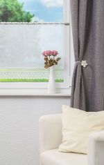 Süß, zart, verspielt und verträumt ist der Charakter dieser Scheibengardine. Der weiße, leicht durchsichtige, fast leinenartige Stoff bringt auch eine angenehme Natürlichkeit in den Raum. Im unteren Bereich findet sich eine fantasievolle Blütenstickerei wieder, die vor allem durch ihre Detailverliebtheit und Filigranität überzeugt. Auch im oberen Bereich, beim Stangendurchzug, sind dezente Stickereien zu finden. Durch den verspielten und verträumten Charakter der Bistrogardine kann man sich den Einsatz im Wohnzimmer genauso gut vorstellen wie im Essbereich und in der Küche. Zu einem freundlichen, einladenden Ambiente trägt neben dem hellen, unifarbenen Stoff auch das transparente Polyestergewebe bei, das intensive Sonnenstrahlen etwas dämpft, dabei weiterhin milden Lichteinfall zulässt.