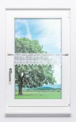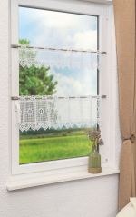 Durch das schmale Design ist diese Scheibengardine ein ausgesprochen feines, dekoratives Element, das Ihre Fenster geschmackvoll in Szene setzt. Mit dem luftigen Behang am Fenster verändert sich der Lichteinfall kaum, der Raum wirkt weiterhin offen und freundlich, gewinnt durch die Scheibengardine an Gemütlichkeit und Wohnlichkeit hinzu. Besonders reizvoll wirken hier die mit Bögen verbundenen kreisförmigen Aussparungen am oberen Abschluss. Das Zusammenspiel der verschiedenen Muster macht das Design abwechslungsreich und lebendig. Dabei finden sich die einzelnen Gestaltungselemente, ebenso das feine Netz, überall auf der Bistrogardine wieder, sodass ein stimmiges Gesamtbild entsteht. Durch ihre außergewöhnliche Form, die Abschlüsse der 5 cm breiten Rapporte erinnern an Blütenblätter, fallen diese zuerst ins Auge.