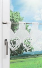 Diese außergewöhnliche Scheibengardine fällt zunächst aufgrund ihrer besonderen Form auf. So können die Rapporte an entgegengesetzt platzierte Vasen, Buchstützen oder schlichte Hängelampen erinnern. Ferner lässt diese Form Assoziationen an den Ausschnitt einer Tracht zu. Zudem sind die Formen mit einer feinen Umrandung verziert. Das halbtransparente Gewebe lässt einfallendes Sonnenlicht etwas milder erscheinen; nichtsdestotrotz erfüllt dieses Modell ausschließlich dekorative Zwecke. Weiteres Highlight dieser Scheibengardine sind ganz klar die ineinander verwobenen, sich überlappenden Kreise, die am eigentlich geraden, unteren Abschluss eingesetzt wurden und einen Großteil der Scheibengardine ausmachen. Das Zusammenspiel der Kreise erinnert an eine große Blütenform, die aufgrund der verschiedenen Muster und Strukturen in den einzelnen Flächen fast dreidimensional wirkt. Mit Stangendurchzug wird der Behang am Fenster befestigt; verwenden Sie dafür eine Klemm- oder Pinnstange geht das ganz ohne Bohren mit simpler Spanntechnik.
