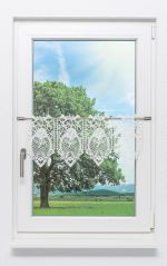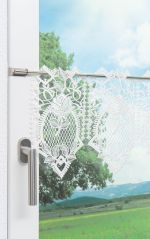 Kunstvoll mit Häkelspitze verziert umspielt die Scheibengardine luftig und locker das Fenster. In das feine Geflecht sind prachtvolle Rosenblüten eingearbeitet, die für eine verspielt-romantische Note sorgen. Der transparente Behang dient ausschließlich dekorativen Zwecken und ist als Bistrogardine vor allem in Küchen zu finden. Den Boho- oder Landhausstil kann diese Scheibengardine toll ergänzen. Der obere und der untere Abschluss sind mit Rosenblättern und weiteren Details geschmückt. Durch die Aussparungen am oberen Abschluss wird die Gardinenstange hindurchgefädelt. Somit ist der Behang im Nu am Fenster befestigt. Orientiert am Rapport von 16,2 cm ist diese Scheibengardine in verschiedenen Breiten erhältlich.