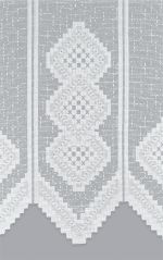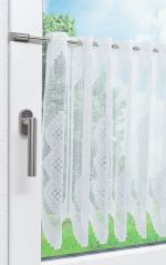 Wie schön Sie ein Fenster mit Scheibengardinen dekorieren können, sehen Sie an diesem Modell. Die klassische Raute zählt zu den Mustern, die scheinbar nie aus der Mode kommen. Auch hier präsentieren sich die ebenen Vierecke mit ihren vier gleich langen Seiten äußerst vielseitig. Es ist, als blicke man in ein Kaleidoskop. Immer wieder gibt es neue Formen und Gebilde zu entdecken. Auf den Stoffbahnen sind die Motive wie Platzdeckchen miteinander verwoben, in der Bordüre sowie am unteren Rand bilden sie einen treppenartigen Abschluss, der zickzackförmig durch das transparente Polyestergewebe läuft. Auch wenn die Gardine das Fenster nicht komplett verdeckt, bleibt der Blick nach draußen weitgehend frei, sodass Sie sich ein Stück Natur und Freiheit nach drinnen holen können.