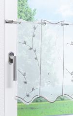 In vielen Wohnstilen sind Scheibengardinen ein beliebtes Gestaltungsmittel, um Fenster anspruchsvoll und modern zu dekorieren. Bevorzugen Sie außerdem ein helles und freundliches Flair, ist dieses Modell die perfekte Alternative. Das transparente Polyestergewebe lässt Tageslicht leicht gedimmt ins Zimmer, den Blick ins Freie jedoch unverstellt. Sein florales Muster wirkt dezent, dennoch weckt es die Aufmerksamkeit des Betrachters. Blattranken ziehen sich ausladend über die gesamte Stoffoberfläche. Die Blätter sind als Lochspitze gestaltet, ihre Umrisse kunstvoll bestickt. Während der wellenartig geschnittene untere Abschluss nicht minder dekorativ wirkt, dient das geradlinig verlaufende obere Gardinenende ausschließlich funktionellen Zwecken. Für den Stangendurchzug sind rechteckige Cut Outs eingearbeitet. Damit lässt sich die hübsche Scheibengardine bequem ins Fenster hängen.