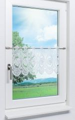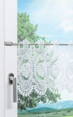 - Eine transparente Scheibengardine aus Plauener Spitze®, 100 % Polyester.