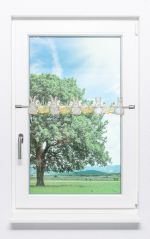 Bei der Farbgebung dieser Scheibengardine spielen vor allem die Umrisse und Konturen eine Rolle, die das ansonsten weiße Gittergewebe wunderbar aufleben lassen. So sind die Häschen braun umrandet, die Ostereier in einem warmen Gelbton gestaltet. Für die natürliche Note sorgt außerdem das Grün der Osterglocken, wobei sich deren Blüten hier überraschend in Weiß weniger bunt und fröhlich, dafür äußerst geschmackvoll und edel präsentieren.