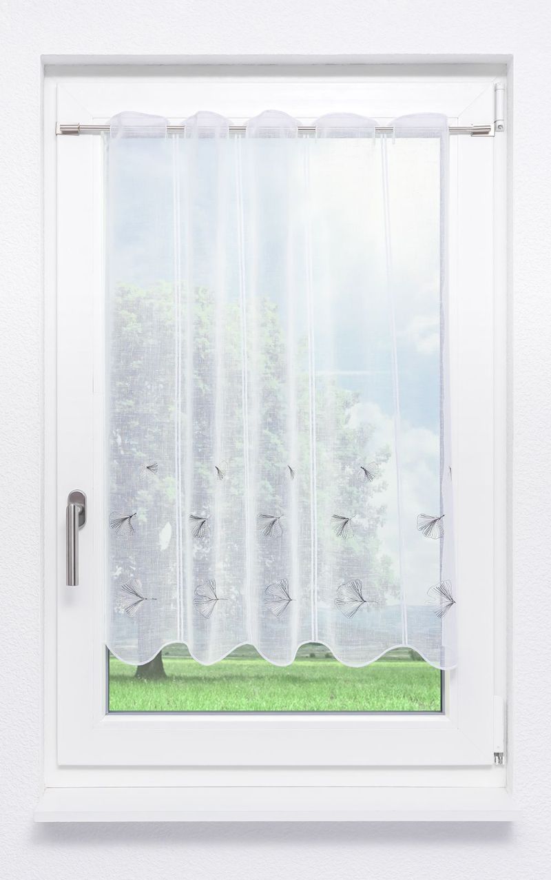 Diese durchsichtige Bistrogardine verbindet zeitlose Eleganz mit modernem Design. Das abstrakte Motiv mit Ginkgoblättern, das sich durch feine Stickereien und edle Schimmereffekte auszeichnet, trägt auch durch die dezente Farbgestaltung zu Ausgeglichenheit und Harmonie bei. Der Behang mit Stangendurchzug kann ohne Bohren ins Fenster gehängt werden. Die dafür notwendigen Aussparungen sind raffiniert in den oberen Abschluss integriert. Durch den transparenten Stoff wird das Licht nur leicht gedämpft, die Gardine erfüllt vor allem dekorative Zwecke.