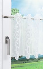 Elegant und vornehm wirkt diese mit prachtvollen Ornamenten verzierte Scheibengardine in Weiß. Es scheint ein angenehmer Hauch von Frische durch den Raum zu wehen. Besonders in Kombination mit warmem Holz und weiteren Naturmaterialien entfaltet diese Scheibengardine ihre ganze Wirkung. Um die Eleganz zu betonen, setzen Sie eisige Blautöne und zeitlos schöne Graunuancen ein.